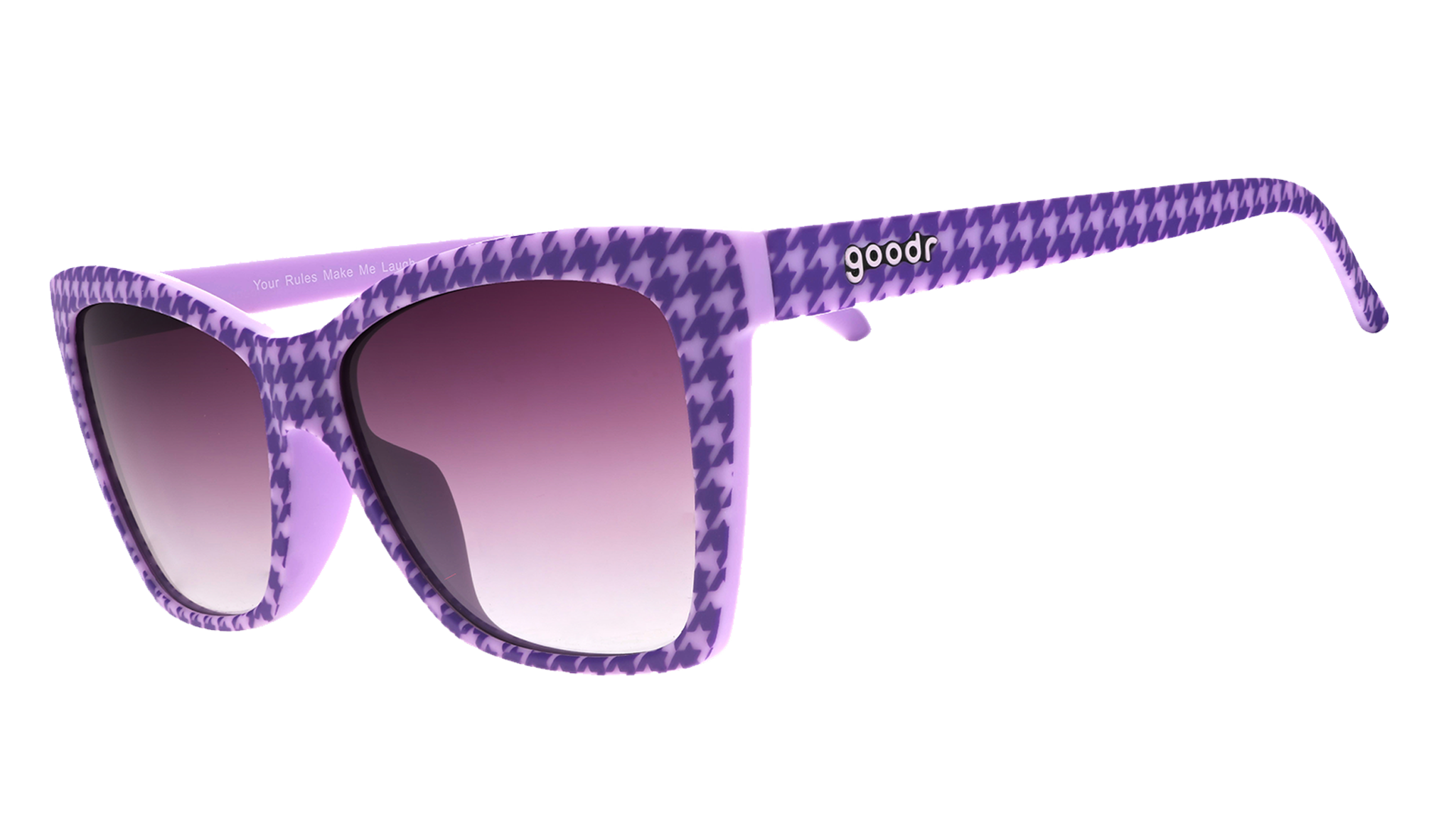 These purple houndstooth print Pop Gs with purple gradient lenses defy the laws of fashion. Why, they practically spit on stupid, antiquated ideas like "denim on denim is a no-no." Uh, excuse us, have you SEEN a Canadian tuxedo before?! *Chefs kiss*