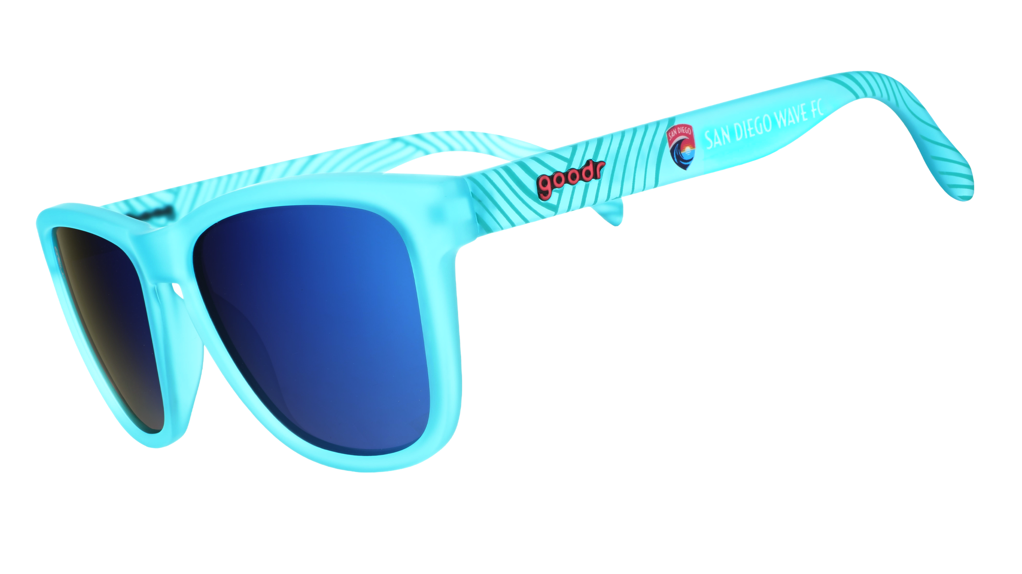 Catch the fútbol vibes with San Diego Wave FC sunglasses! Featuring vibrant blue translucent OG frames, purple-blue reflective lenses, and custom NWSL packaging. Big energy, bigger waves, and no sand in weird places. Catch this wave or get crushed.