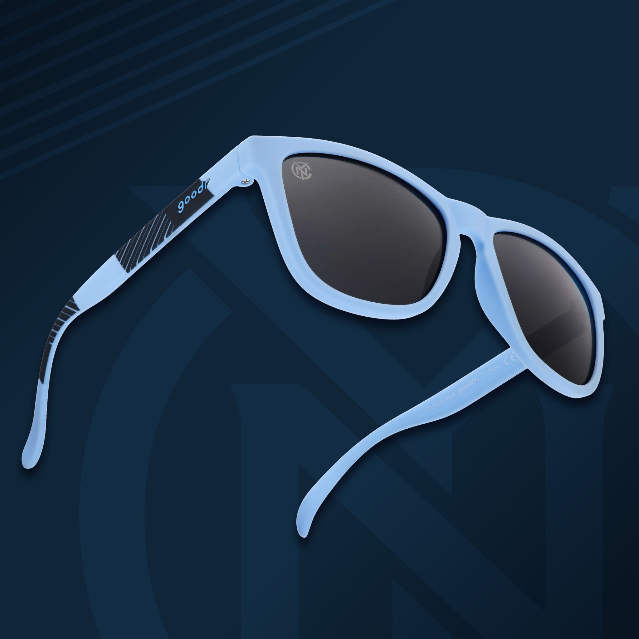 For the NYC FC fans who rep all five boroughs and still make it to Yankee Stadium on time. These light blue and navy patterned sunglasses with black non-reflective lenses are hotter than the third rail! Includes MLS packaging. because otherwise. fuggedaboutit.
