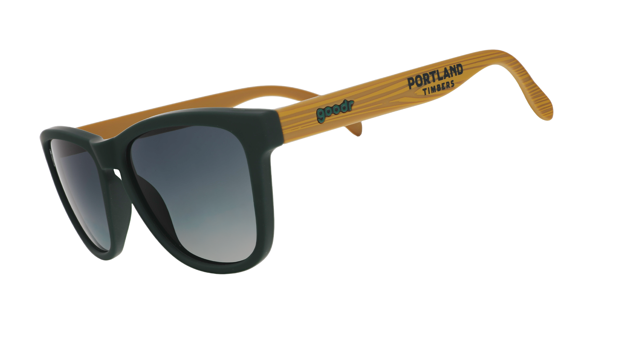 Ready to chant PT-FC?! These Portland Timbers sunglasses feature wood-patterned frames. green gradient lenses. and Major League Soccer packaging.