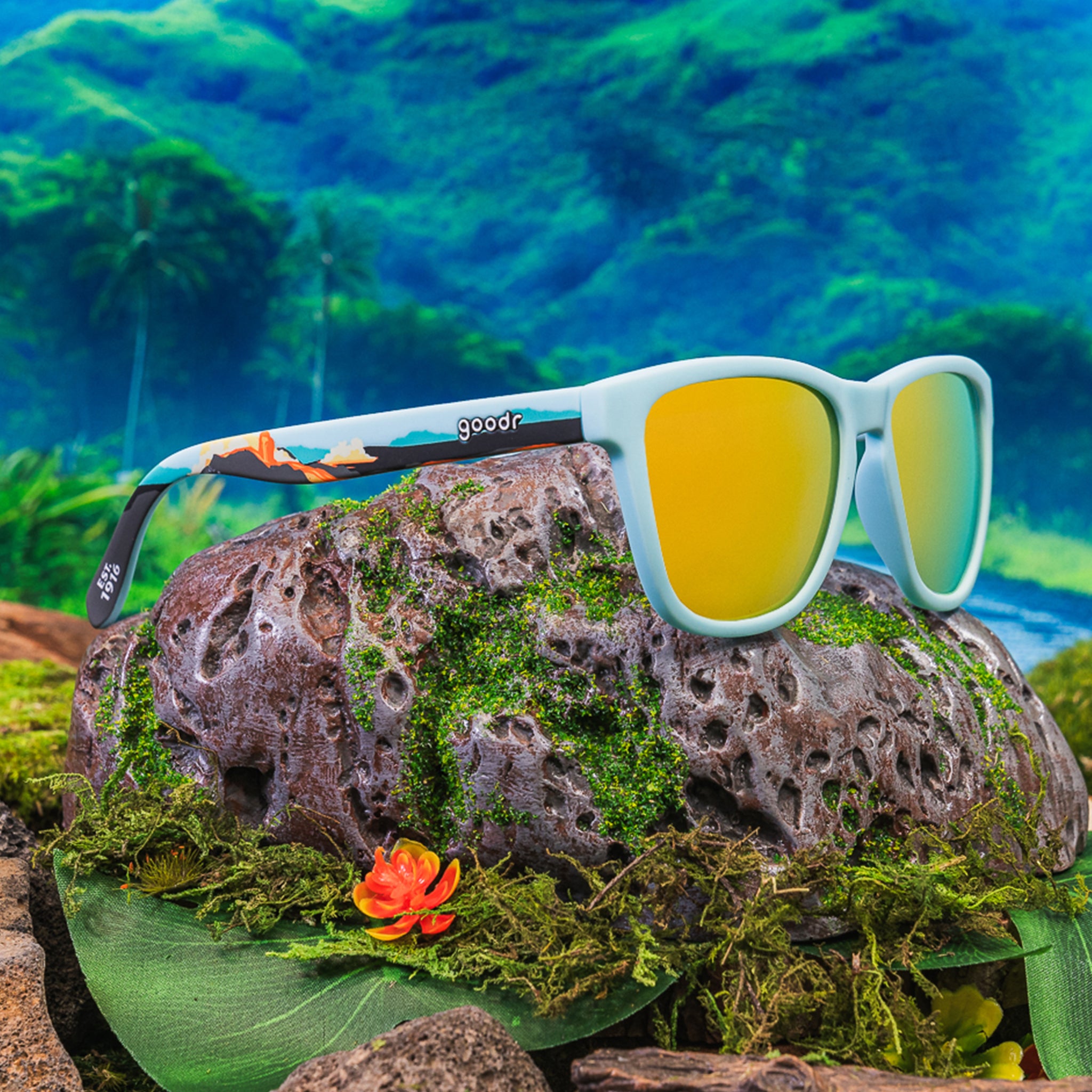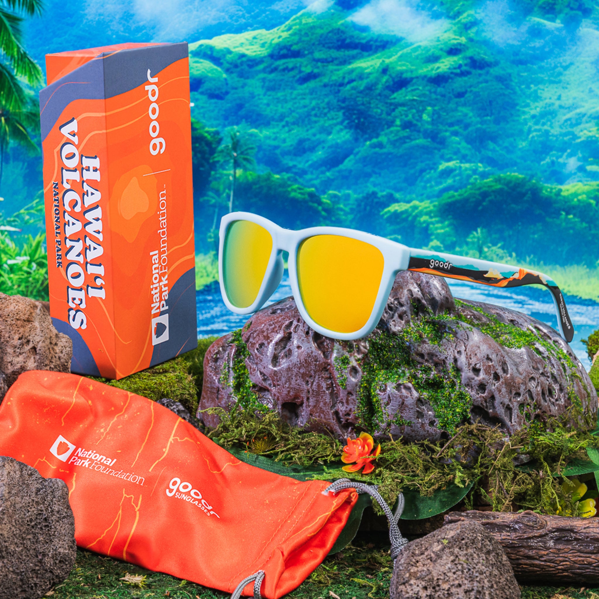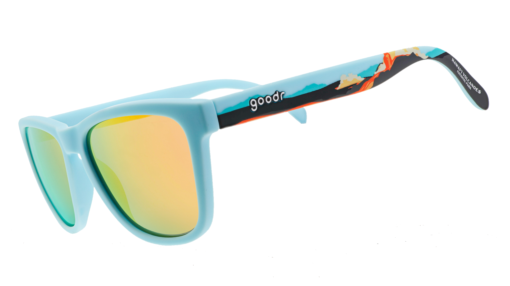 Hawai’i Volcanoes National Park protects some of the world’s most unique geological. biological. and cherished cultural landscapes. These limited-edition light blue OG shades with amber reflective lenses feature a design on the arms showcasing the park’s incredible volcanoes.